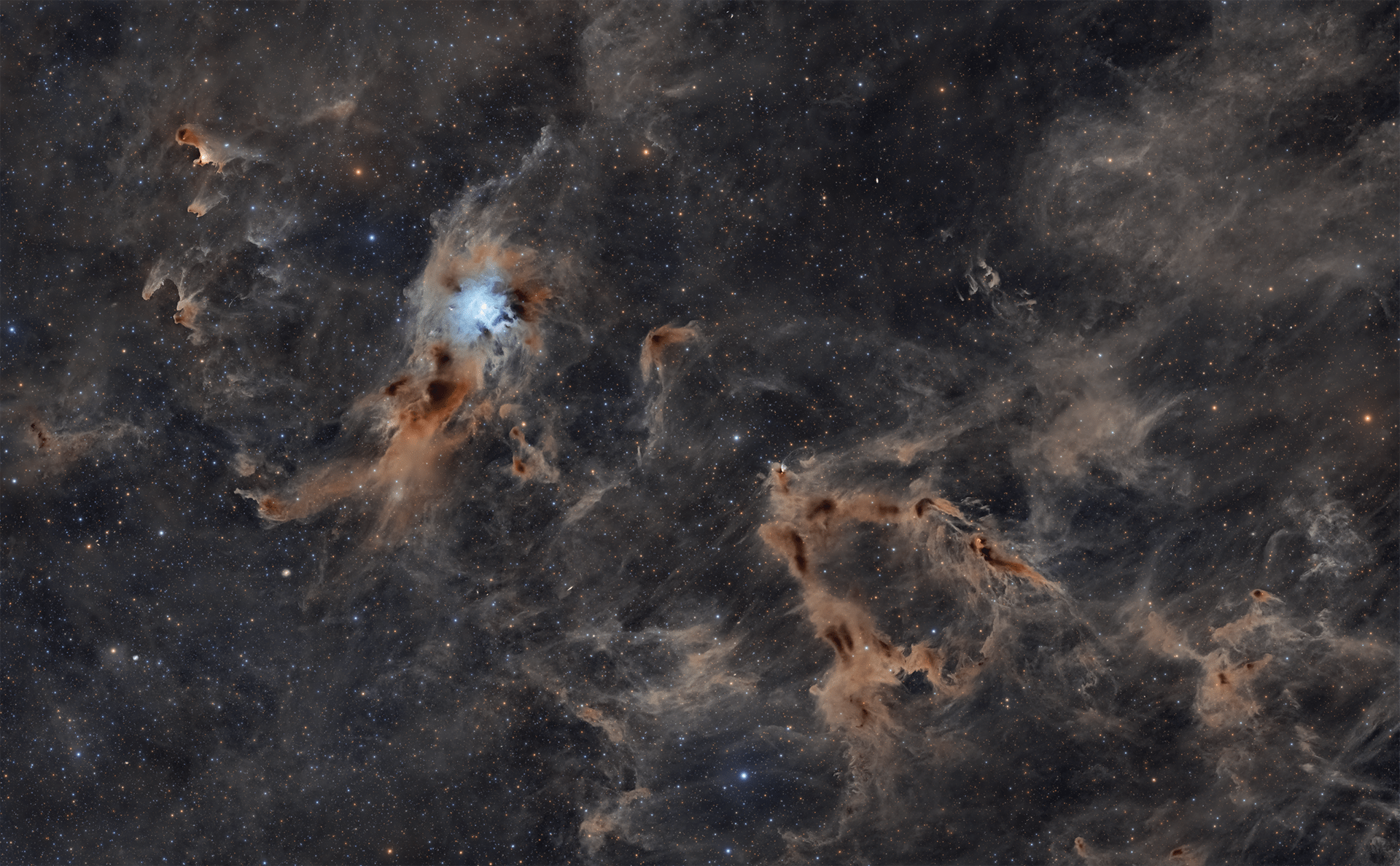La région immortalisée par la Team FACT est un carrefour complexe où se croisent l’ombre et la lumière. En traversant cette image, on parcourt des centaines d’années-lumière de gaz, de poussières et de nurseries stellaires.