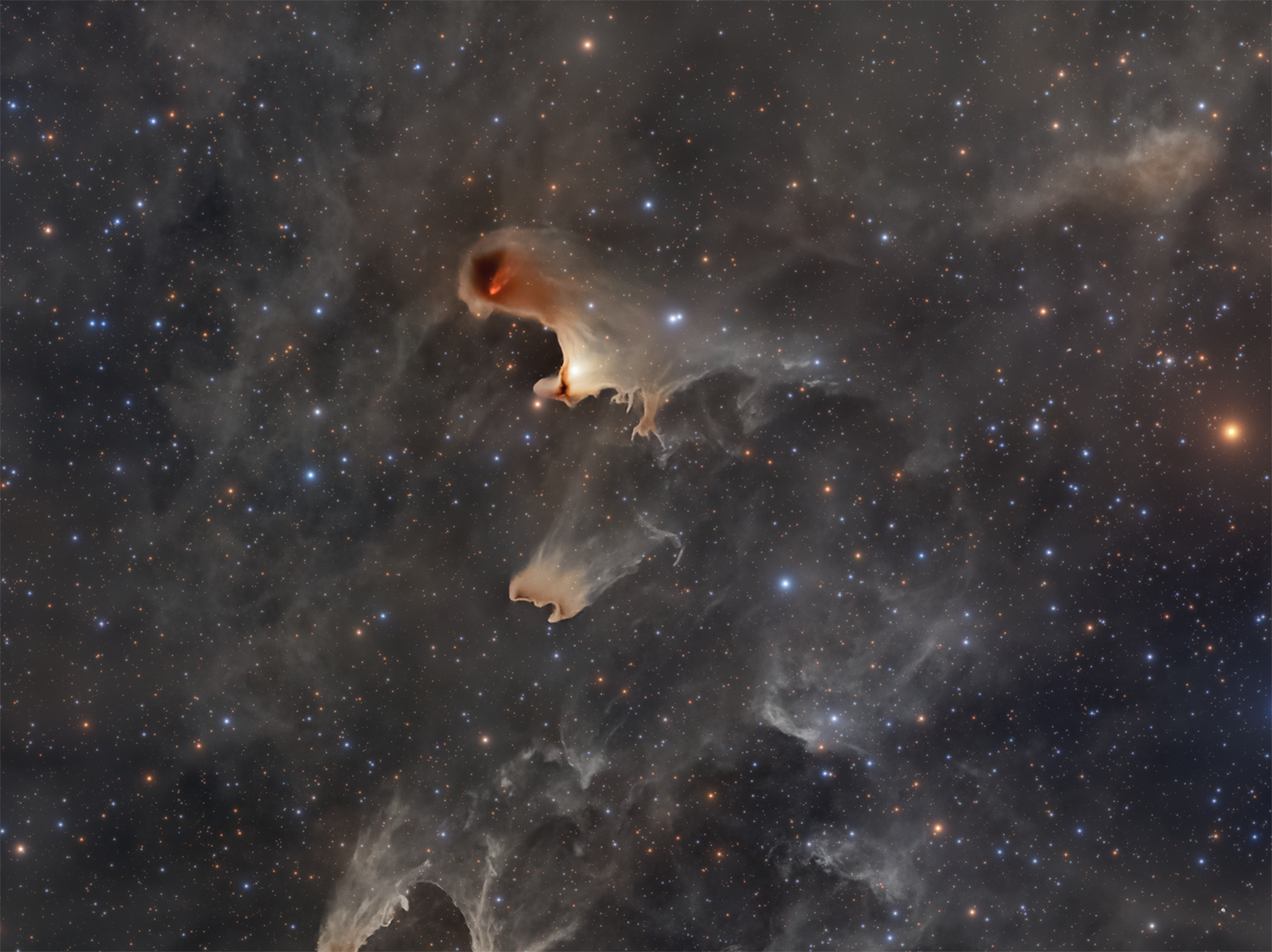 Située à environ 1 500 années-lumière, cet ensemble est un « globule de Bok ». Sous ses airs de silhouette éthérée, c’est un cocon de poussières ultra-denses où la gravité est en train de sculpter les étoiles de demain.
