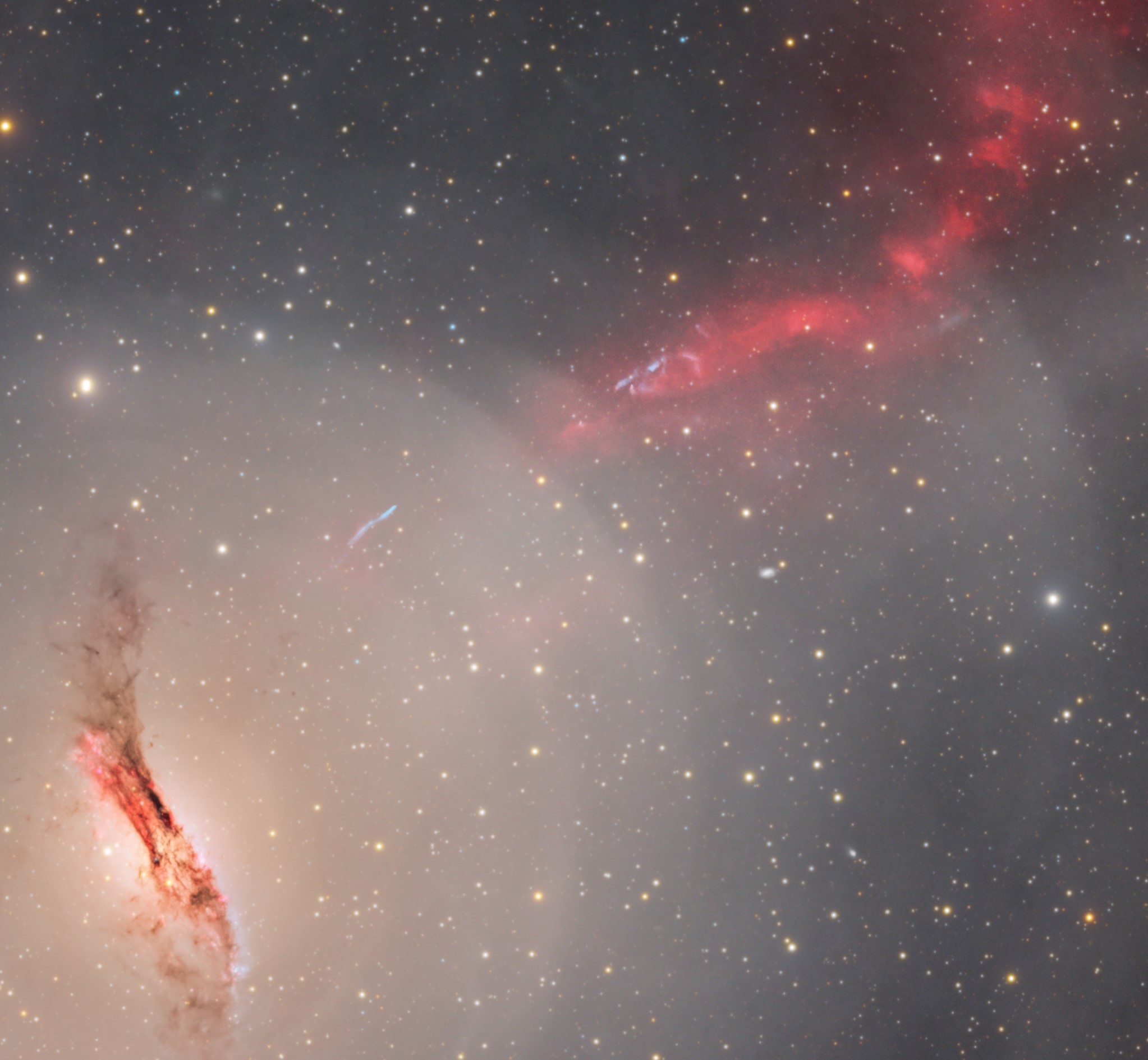 Observer Centaurus A, c’est aussi regarder à travers les voiles de notre propre galaxie. L’avant-plan de cette zone du ciel (au-delà des étoiles de notre galaxie) est largement parcourue par des « cirrus galactiques » (IFN) et les restes de la nébuleuse de Gum, un vestige de supernova ancestral qui baigne le champ d’une lueur hydrogène diffuse. Ce mélange entre les structures lointaines de NGC 5128 et les gaz de notre Voie Lactée crée une profondeur de champ presque vertigineuse.