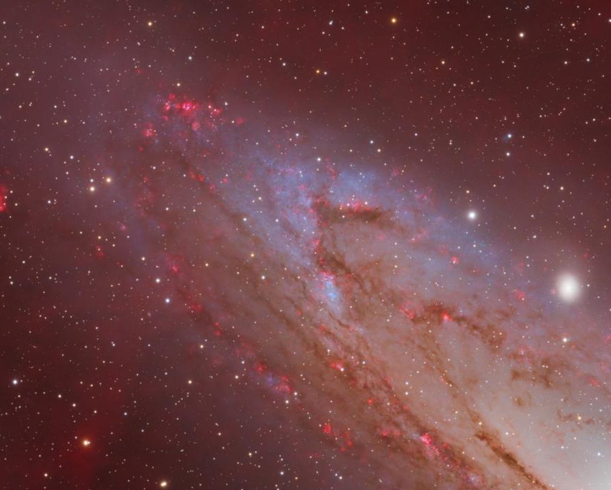 Pour voir où la création d’étoiles est active au sein de la galaxie, le RGB ne suffit pas. Il faut utiliser un filtre Ha qui ne laisse passer que la longueur d’onde spécifique émise par l’hydrogène ionisé. Les bras spiraux se parent alors de « rubis » : ce sont les nébuleuses en émission (régions HII), d’immenses nuages de gaz ionisés par le rayonnement ultraviolet des jeunes étoiles bleues qu’ils contiennent. L’image mise à l’honneur ici les montre avec une clarté superbe. On distingue notamment NGC 206, la plus grande et la plus brillante de ces « pouponnières » d’étoiles.