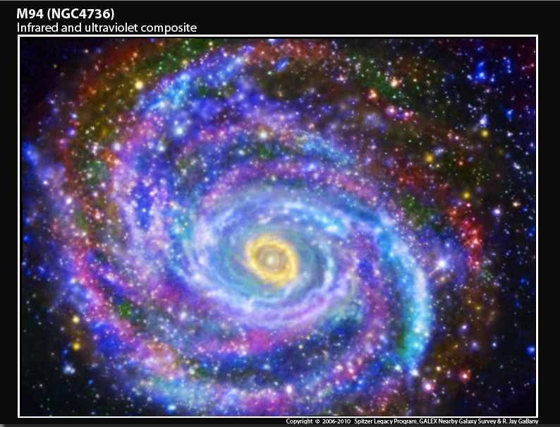 Outre ces bras périphériques qui créent une impression visuelle de « halo diffus », M94 renferme une autre structure « interne » en forme d’anneau, à proximité du noyau.