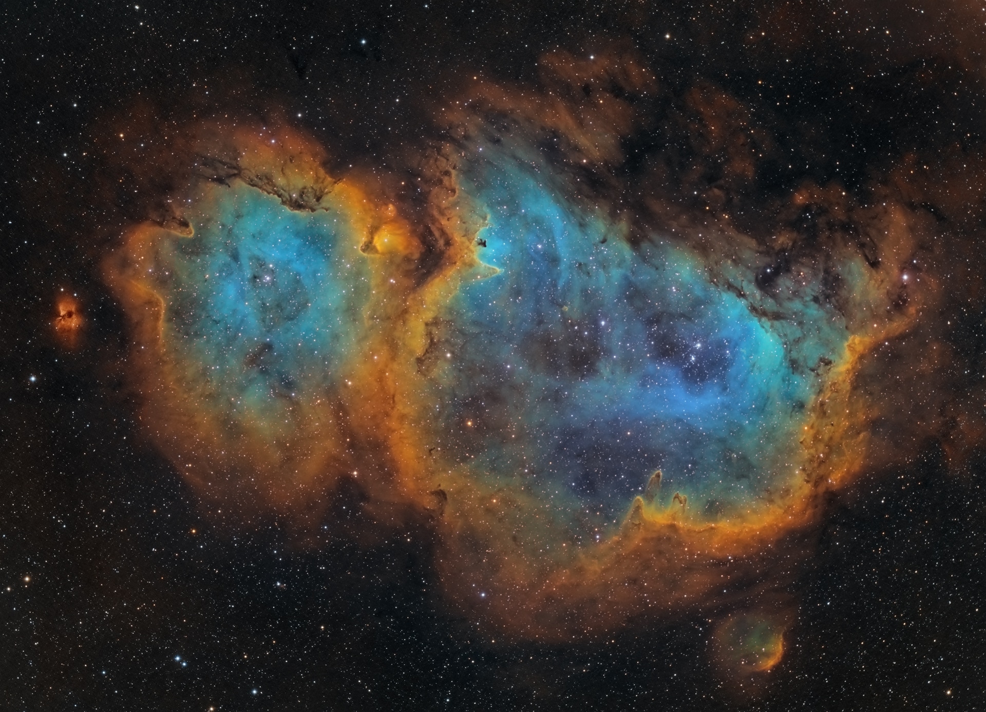 IC 1848 regorge de zones de nébulosités assez faibles, notamment dans les régions périphériques. Dans certaines zones même, la délimitation entre le fond de ciel et la nébuleuse n’est pas clairement marquée ; c’est le cas par exemple sur cette image dans le coin supérieur-droit, dans la direction de la nébuleuse du cœur (les deux nébuleuses étant reliées par un « pont » de matière). En conséquence, il peut être délicat de distinguer les plus faibles nébulosités du “bruit” photonique dans le fond de ciel, soit en raison d’un ciel affecté par la pollution lumineuse, soit d’un temps de pose insuffisant. Le traitement mis en œuvre doit donc être adapté à ces éventuelles limitations, et être proportionné au signal qu’il est réellement possible de mettre en valeur sur l’image finale.