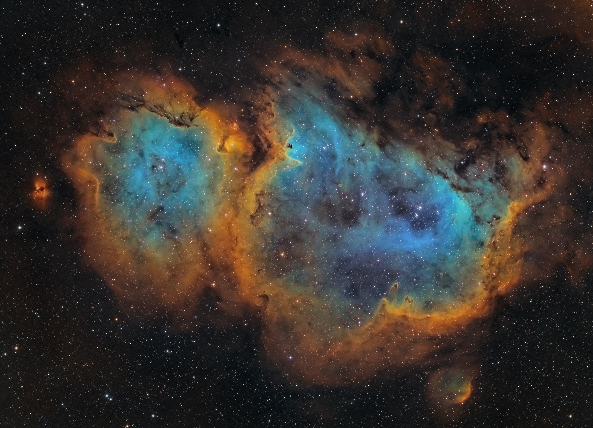 Sur cette nébuleuse, l’avantage du SHO est de permettre une grande richesse de couleurs ; là où les versions LRGB donnent plutôt un résultat uniformément « rouge ». Si le niveau de détails est identique entre les deux versions HOO et SHO (la même image Ha ayant été utilisée comme couche de luminance), on voit que la version SHO permet de révéler beaucoup plus de nuances subtiles, synonymes de variations dans la composition physique de la nébuleuse.