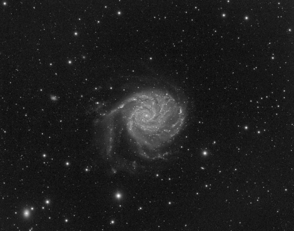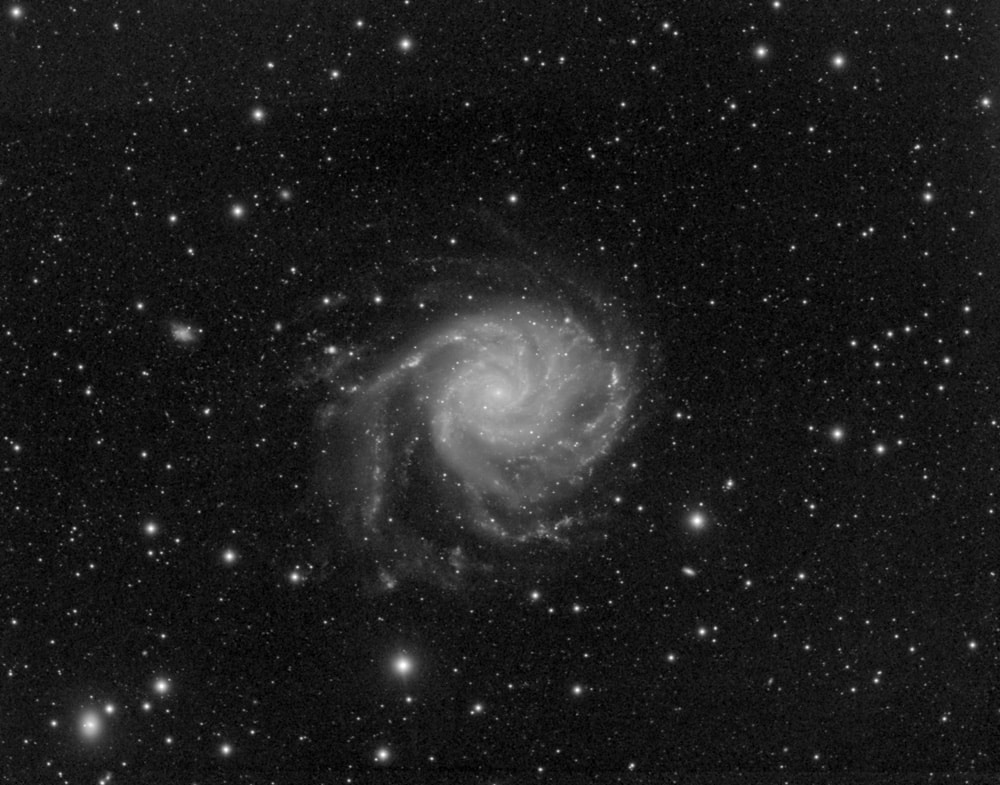 Bien que M101 soit, en dimensions apparentes, l’une des plus grandes galaxies accessible aux amateurs, sa prise de vue est cependant loin d’être simple dès lors qu’on se fixe pour objectif de mettre en valeur au mieux ses bras spiraux ! En effet, sa magnitude de surface est assez faible et, de ce fait, il est impératif de prévoir un temps de pose significatif pour obtenir un signal exploitable loirs du traitement, en particulier dans les bras spiraux et les extensions plus faibles, uniquement visibles ici sur la version CCD.