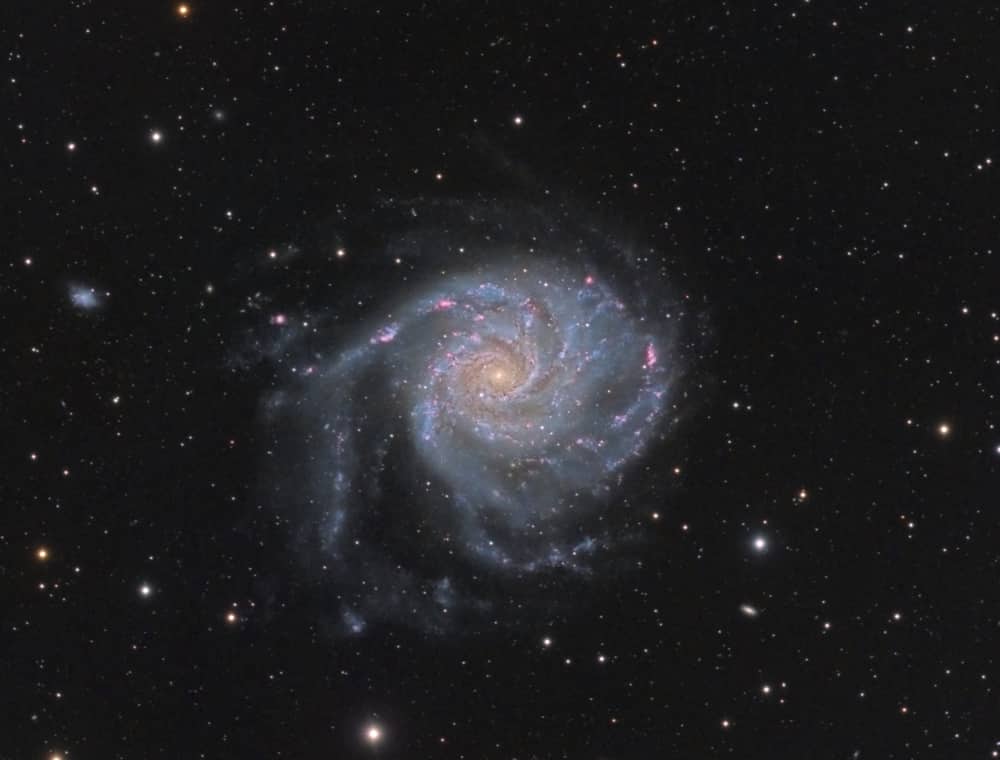 Située à 23 millions d’années-lumière de notre Voie Lactée, M101 est une galaxie spirale de grande taille : environ 70% plus grande que notre Galaxie, et plus grande encore que notre proche voisine M31 (la galaxie d’Andromède), avec 170 000 années-lumière de diamètre. Contrairement à cette dernière, qui est pratiquement vue par la tranche, M101 se dévoile de face, permettant ainsi d’apprécier l’ensemble de sa structure, en particulier son bulbe central et ses bras spiraux bien détachés, qui lui ont valu son surnom de « moulinet ».