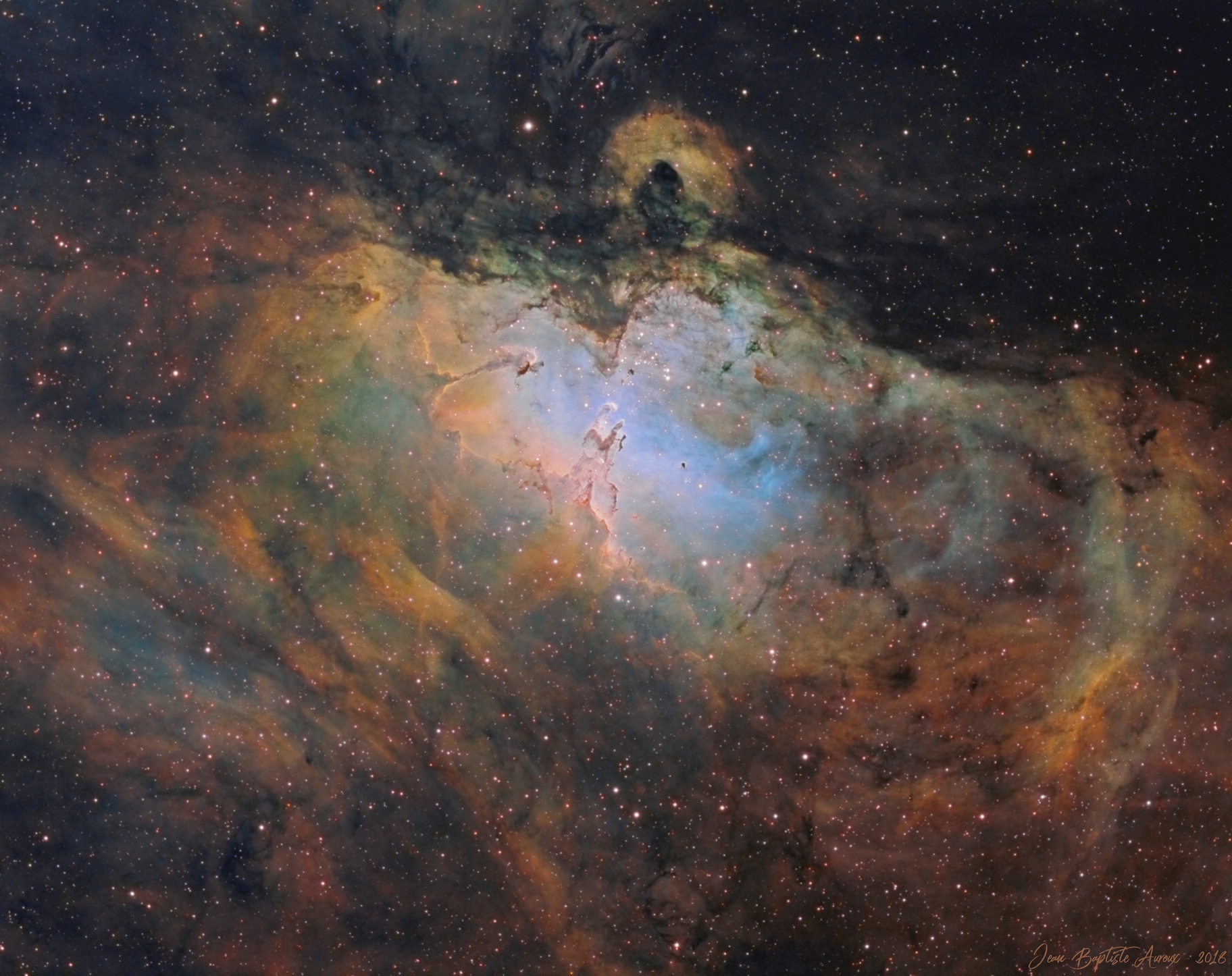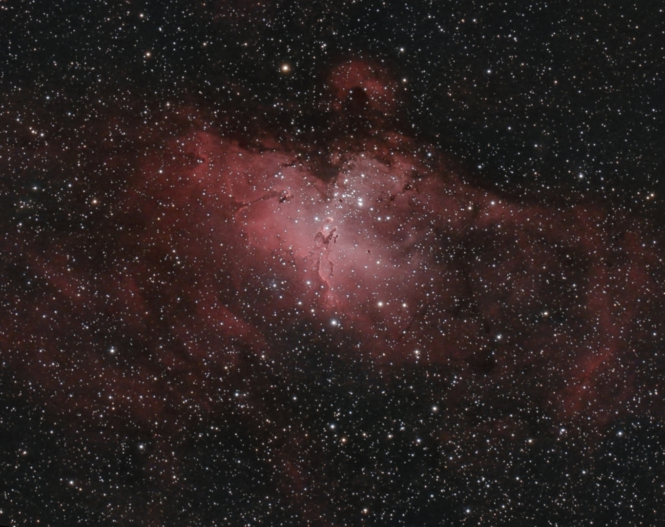 M16 est accessible avec un APN, à condition que celui-ci soit défiltré – comme dans l’image présentée. L’essentiel du rayonnement de la nébuleuse étant situé dans le rouge, un APN non-défiltré ne laissant parvenir qu’une petite partie du rayonnement rouge jusqu’au capteur n’offrira que peu de signal à traiter, même dans le cas d’un temps de pose très long.