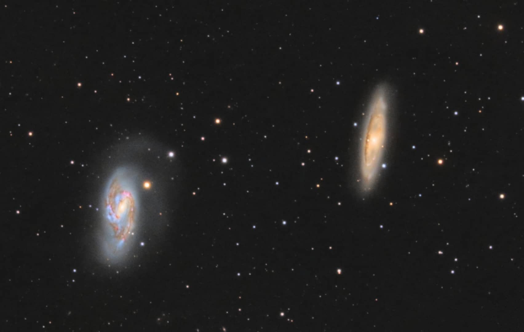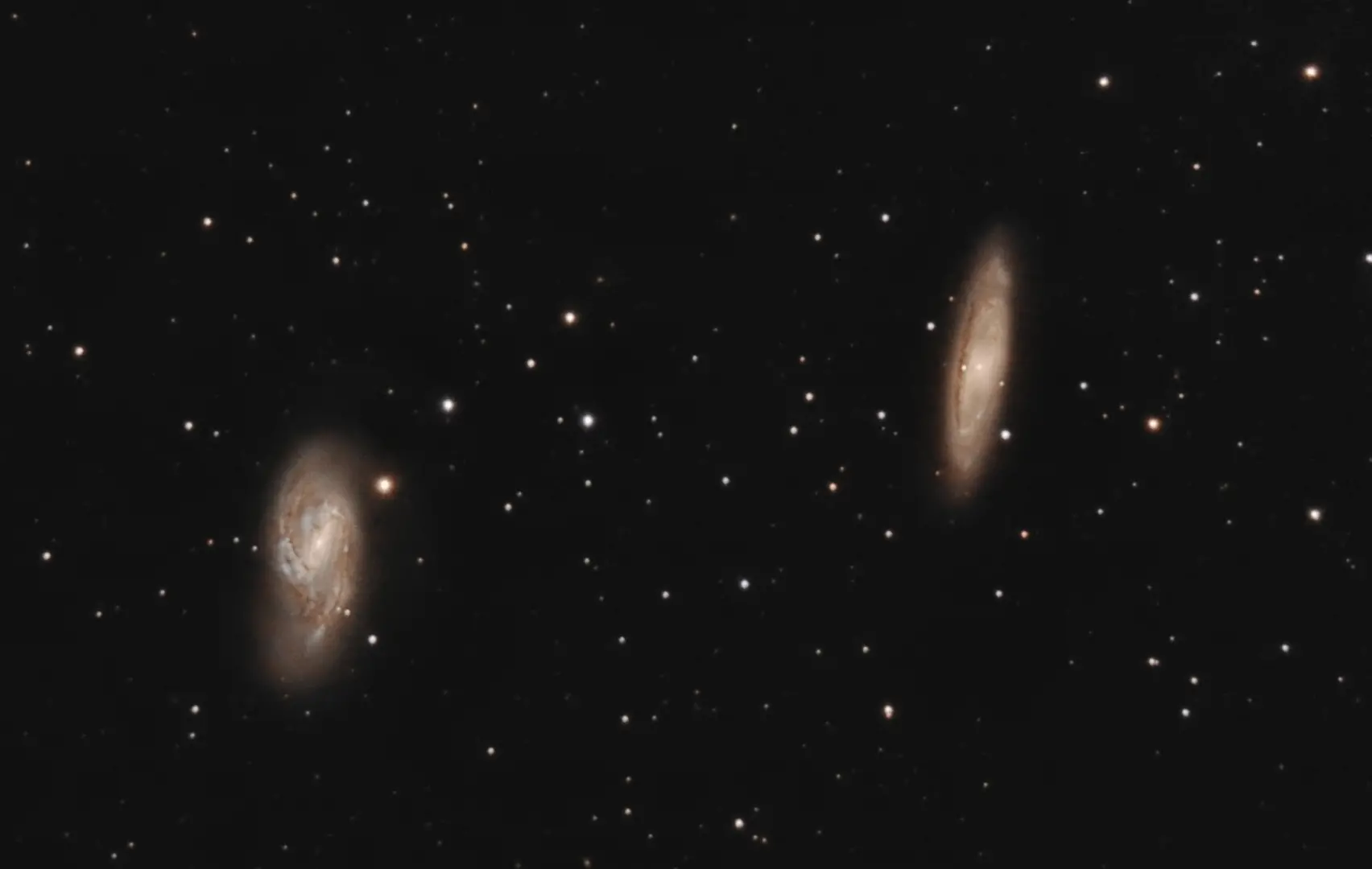 Situées à environ 35 millions d’années-lumière, les galaxies M65 et M66 sont relativement similaires en taille et en luminosité. Leurs structures et leurs couleurs sont en revanche très différentes : spirale pour M65, barrée pour M66 avec une dominante bleutée qui laisse supposer une forte activité de création d’étoiles.