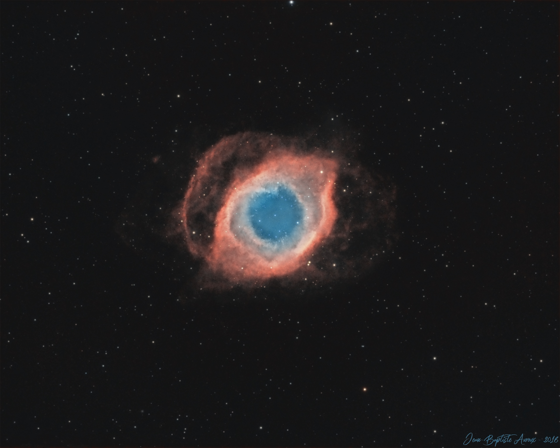 Les nébuleuses planétaires, par la complexité de leur structure et la richesse de leurs couleurs, sont des objets très spectaculaires à photographier. La nébuleuse Hélix, bien que dotée d’une structure relativement « simple » comparée à certaines nébuleuses plus torturées (telle que « l’œil de chat« ), offre déjà un spectacle saisissant avec ses deux anneaux entrelacés. D’autant plus que, située à seulement 700 années-lumière de la Terre, il s’agit du spécimen le plus proche de nous. Sa structure s’étend sur plus de 2,5 années-lumière ; ce qui, compte-tenu de sa distance, en fait également la nébuleuse planétaire présentant le plus important diamètre apparent (quasiment le diamètre apparent de la Lune !).