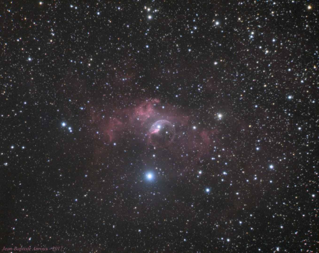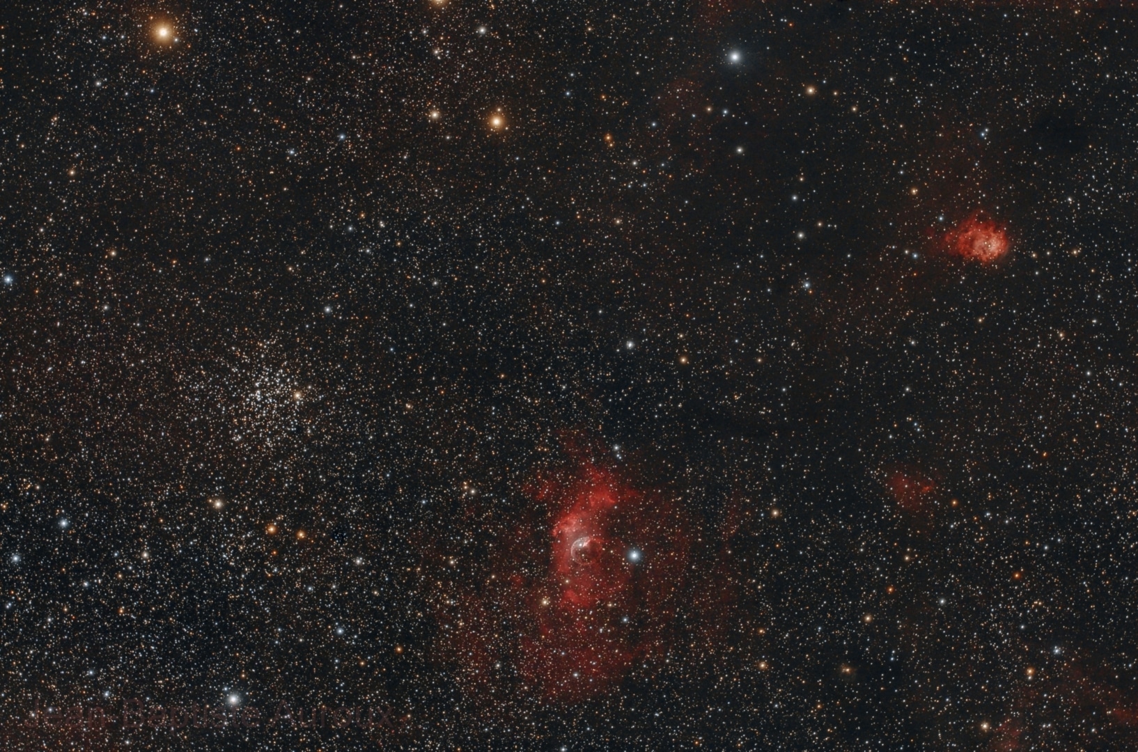 Ce champ large permet d’inclure non seulement la nébuleuse de la Bulle, mais aussi l’amas ouvert M52 ainsi que la petite nébuleuse NGC 7538 (en haut à droite).